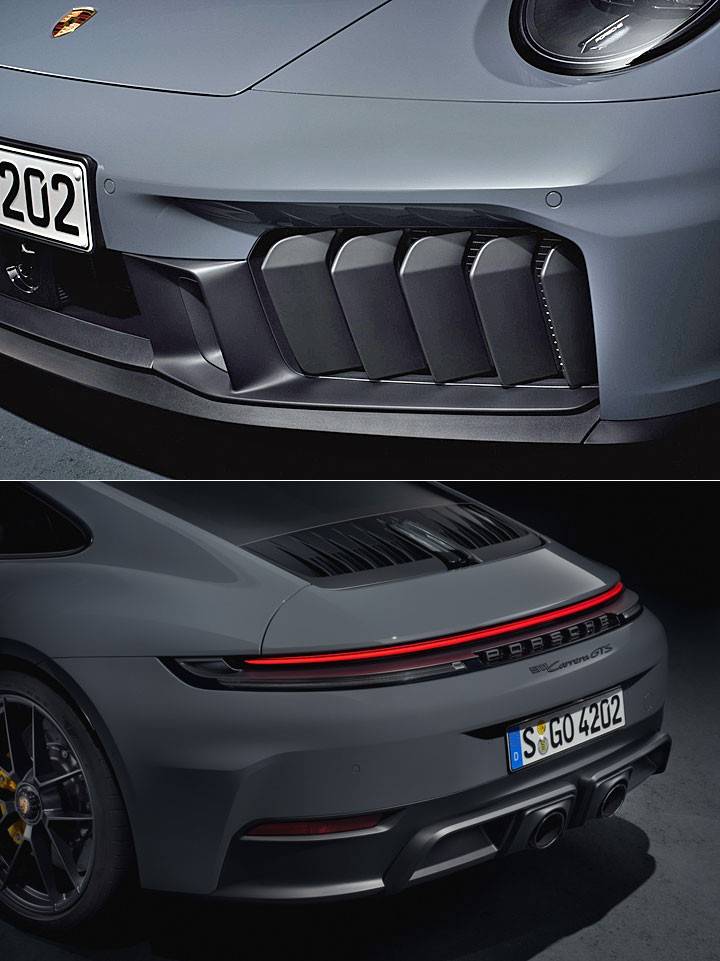 911 首次搭載與主動式冷卻通風葉片連動的主動式前下擾流擴散板,這些元件可因應需求調節氣流。911 Carrera GTS 車型標配 GTS 專屬跑車排氣系統。