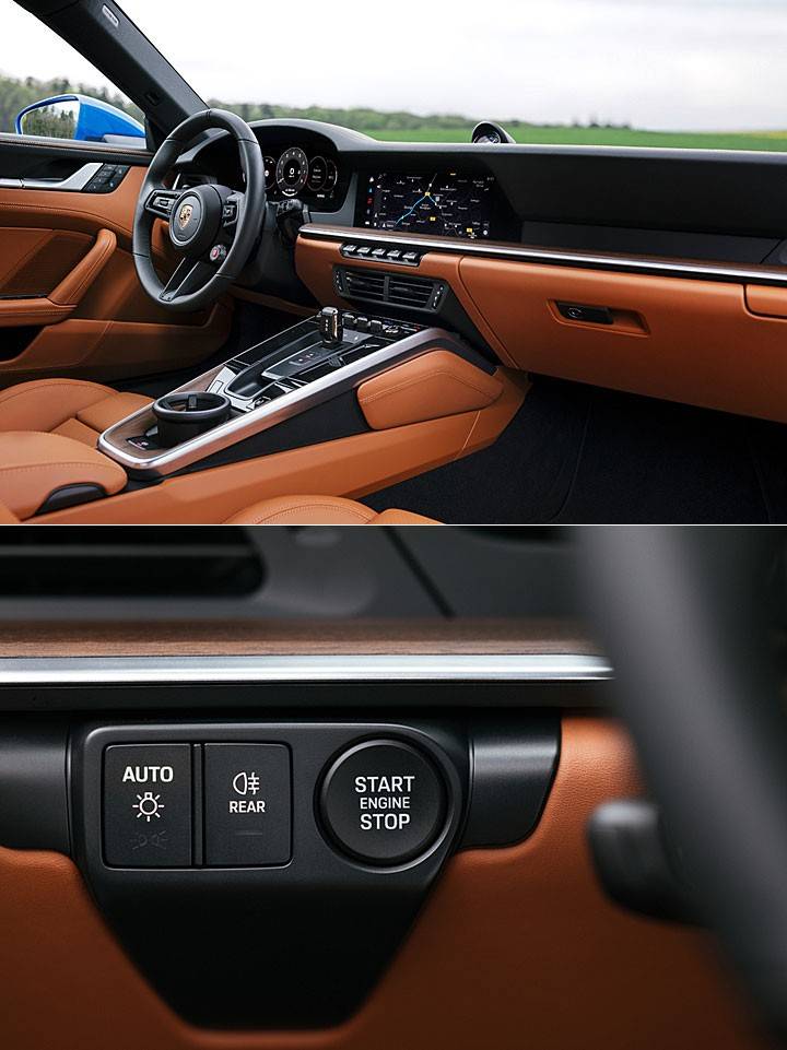小改款 911 采用以駕駛者為中心的「Porsche Driver Experience」概念,駕駛常用控制元件設置在方向盤周圍,包括標配的駕馭模式切換器、經改良的駕駛輔助系統控制桿,以及首次在 911 車系中出現,位于方向盤左側的啟動按鈕,并首次搭載全數位儀表板。