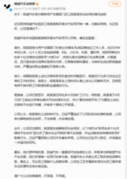 4月17日上午,極越汽車法務部通過官方微博發布情況說明,否認了因員工購買某品牌汽車而解聘的說法。說明中指出,姚先生作為社交媒體/私域運營崗位的工作人員,自年初以來在多個平臺注冊賬號,持續為某品牌進行車友群運營,且只宣發該品牌車型相關內容,具備自媒體屬性,與其崗位職責沖突,違反了職業道德和不競爭義務。公司還指出,姚先生的宣發行為多次發生在工作時間內,并存在無故曠工行為。