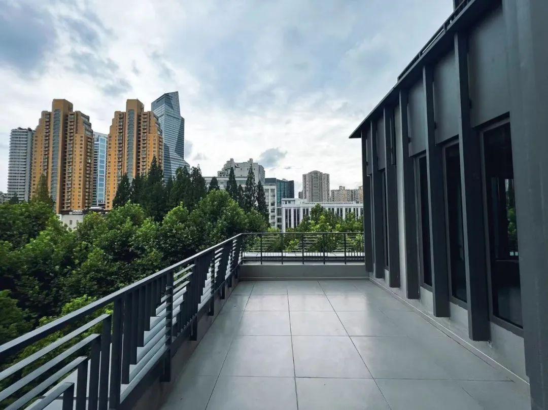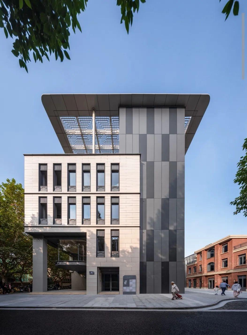在建筑體上方相連的2層空間里,設(shè)計(jì)了挑空的“水晶盒子”,由玻璃和鋼結(jié)構(gòu)組成,在街角極為亮眼,抬頭就能看到;5—6層建筑外側(cè)設(shè)計(jì)了露天陽臺,使高樓的視覺效果更為緩和。仔細(xì)觀察可以發(fā)現(xiàn),A棟頂部以電路板為元素,留出了一處小巧思,巧妙呼應(yīng)了“上海第四電表廠”的歷史。