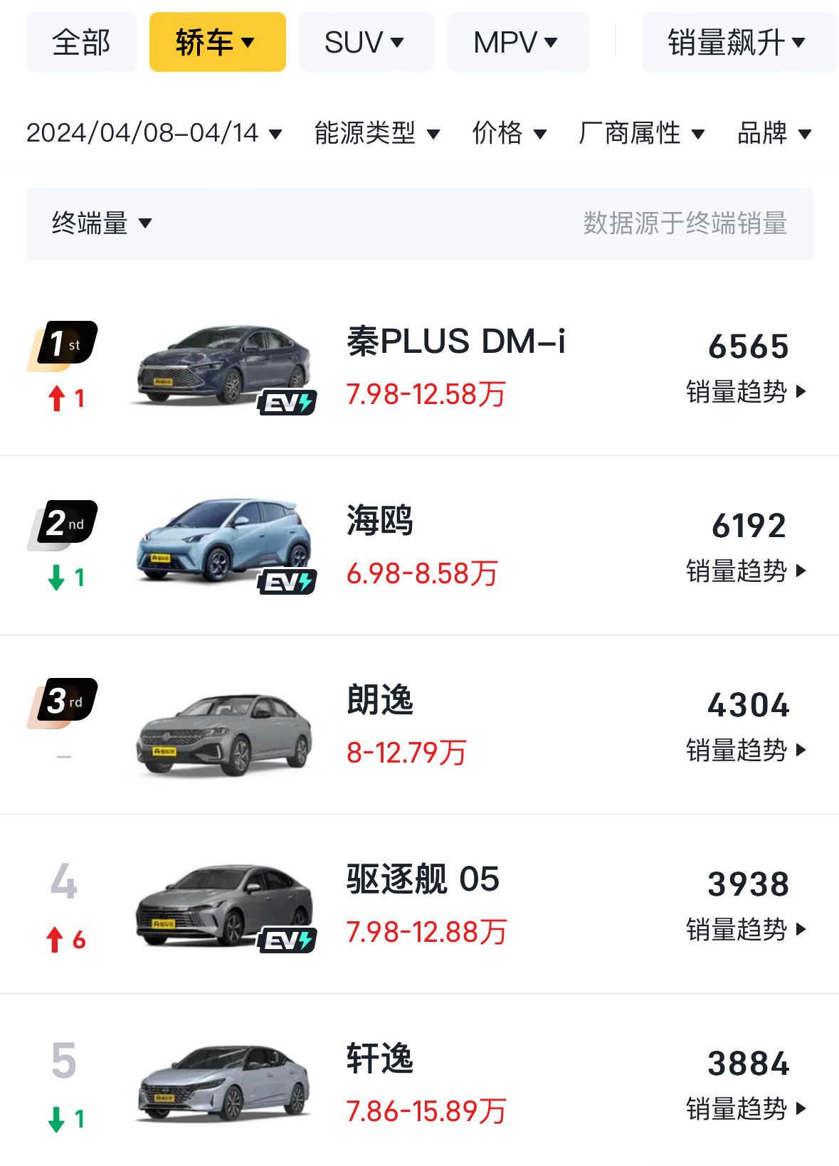 在具體的細分市場上,比亞迪仍然是存在感最強的品牌。轎車市場前十強,比亞迪占據了四個席位。其中,比亞迪秦PLUS DM-i憑借6565輛的成績,奪得了轎車市場銷量冠軍,疊加比亞迪秦PLUS EV 3859臺的銷量成績,比亞迪秦PLUS車系的銷量也突破了1萬臺,是轎車市場唯一破萬的車系。
