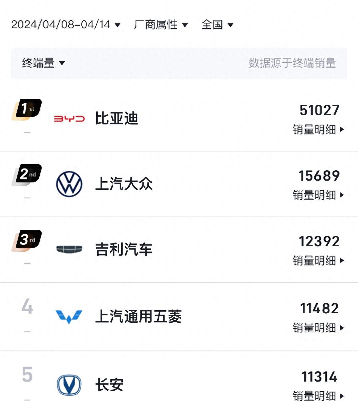 4月17日,國內乘用車市場4月份第二周的品牌和車型銷量及其排名情況出爐。從具體的廠商排名來看,前六強的排名和第一周保持一致,其中比亞迪憑借51027輛的單周銷量成績,繼續穩坐銷量冠軍。并且,從上汽大眾開始,大部分汽車品牌和比亞迪的規模相比,銷量差距均較為懸殊。