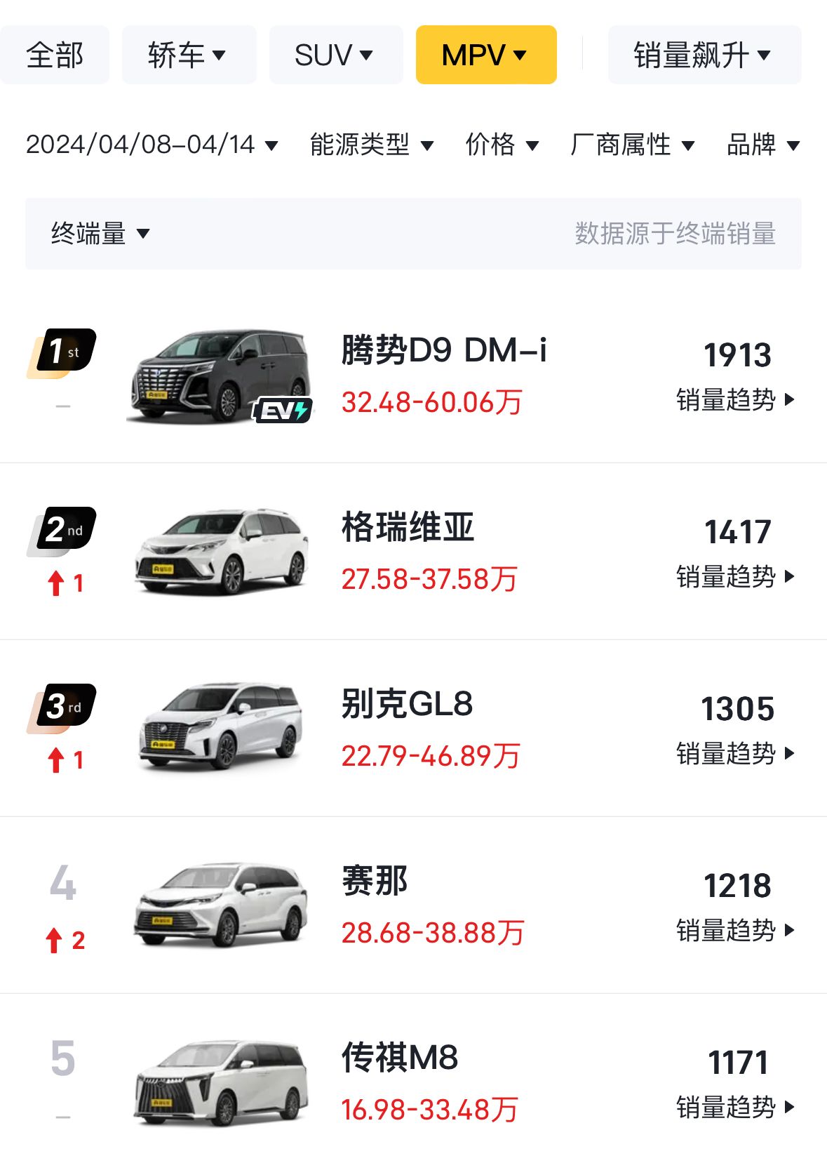 MPV市場方面,騰勢D9銷冠寶座,仍然無人撼動。格瑞維亞作為賽那的姊妹車型,銷量和排名也已經連續兩周超過了賽那。