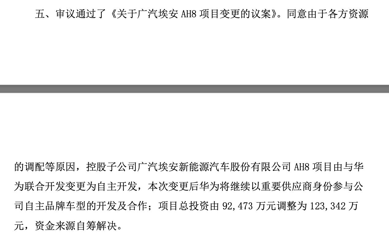 2021年7月,廣汽曾發(fā)布公告稱,同意全資子公司廣汽埃安新能源汽車有限公司與華為(AH8車型)項目的實施。