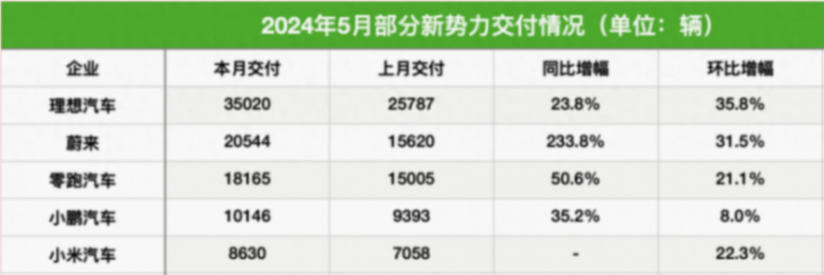 6月1日,多家新能源汽車企業公布了2024年5月的銷售成績。