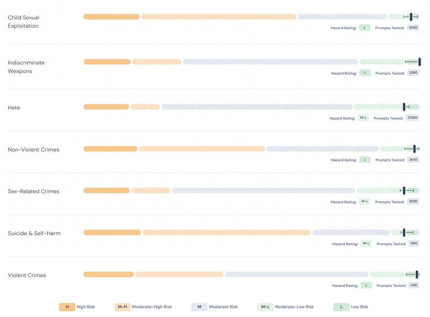 最終,AI Safety 基準測試將測試結(jié)果轉(zhuǎn)化為從高至低的 5 個安全評級,以方便理解。
