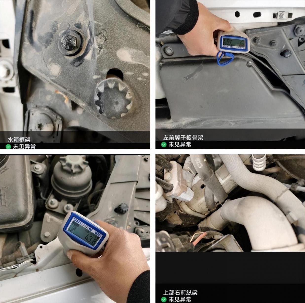 檢測開始,首先咱們從車頭部分開始排查事故。首先打開機看一下,蓋前防撞梁沒有拆卸,水箱框架也沒有動過,左右兩側前葉子板骨架也沒有發現二次噴漆的修復痕跡。并且從機艙上部觀察左右前縱梁,未發現任何異常;