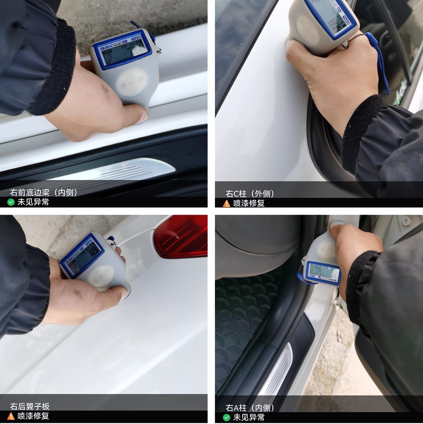 檢測右側右后翼子板有噴漆,但沒有鈑金,右C柱內側數值正常,右底邊梁內側數值正常,右A柱外側有噴漆,但內側正常。綜合來看右側也可以排除存在重大事故的可能性。