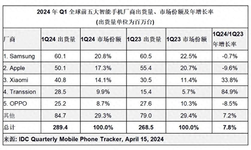 2024年一季度全球手機銷量、以及中國手機市場數據出爐了。