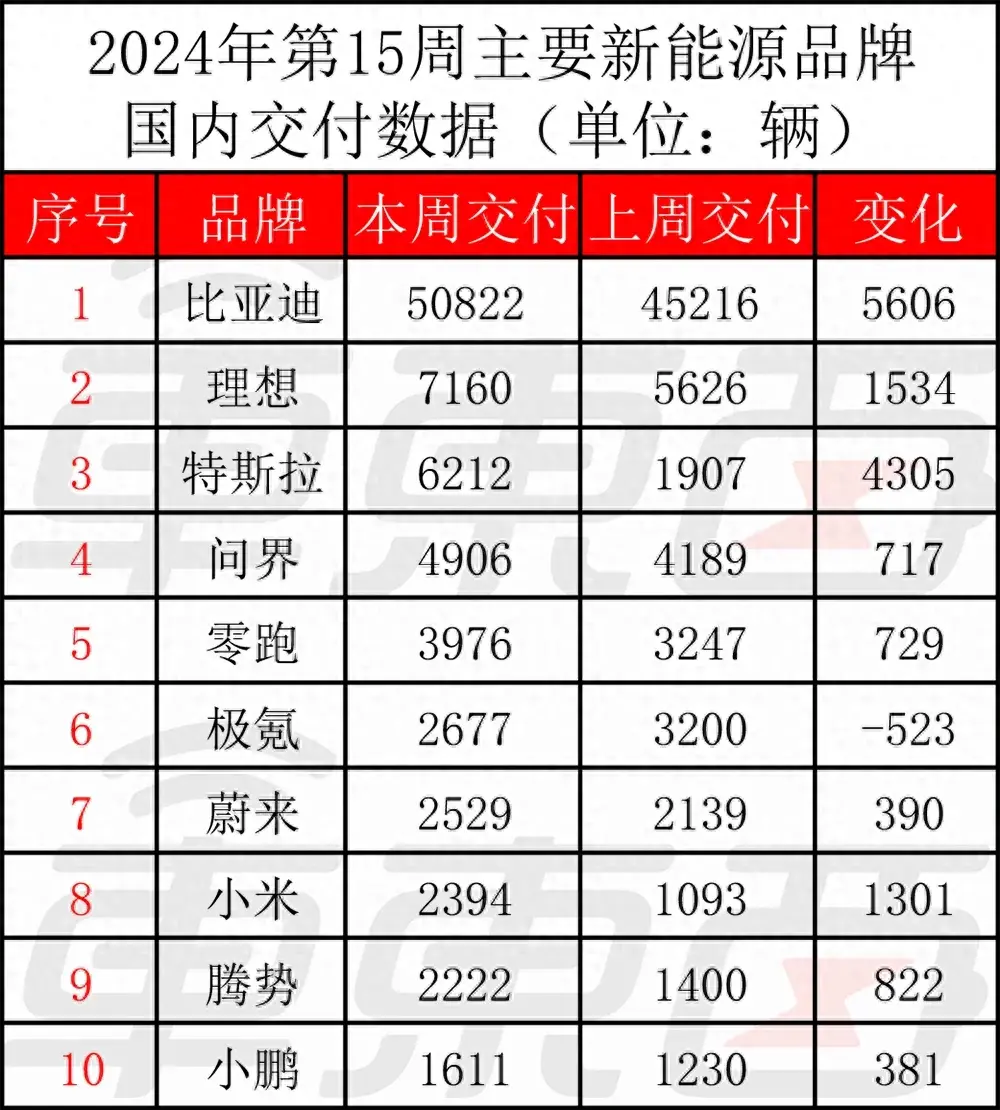 其中比亞迪遙遙領先,一周交付超過了5萬輛,然后再是理想、特斯拉、問界、零跑、極氪、蔚來、小米、騰勢、小鵬,這些品牌都沒有過萬。