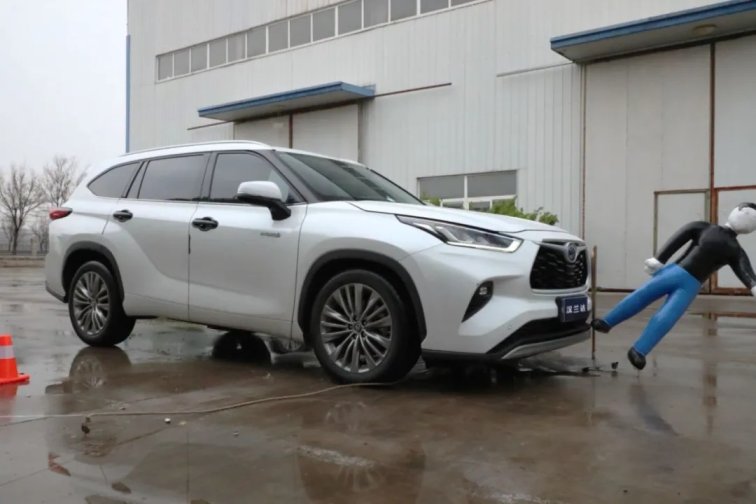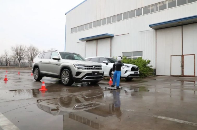 工作人員在測試場地主道路設(shè)置兩臺路邊??康恼系K車,測試假人從障礙車后竄出,分別駕駛測試車輛途昂和漢蘭達(dá)以不超過40公里/小時(shí)撞向假人,看兩臺車AEB對假人的識別能力。