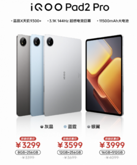 iQOO Pad2售價2499元起,搭載行業全球首發第三代驍龍8s、12.1英寸144Hz超感電競屏、10000mAh大電池,挑戰同檔最強跑分性能。iQOO Pad2 Pro 售價3299元起!行業全球首發天璣9300+、3.1K 144Hz超感電競巨幕、11500mAh超大電池,挑戰安卓平板最高跑分和最強游戲穩幀。