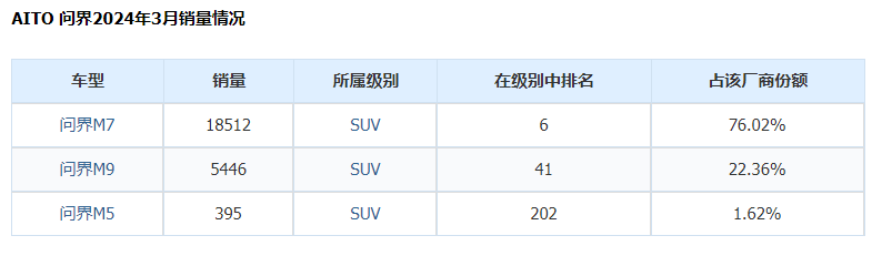 問界3月份銷售31727輛,其中問界新M7在3月份銷售24598輛,是單車型的銷冠;問界M9交付6243輛,是50萬以上豪車中自主品牌冠軍。據(jù)悉,問界新M5增程版即將發(fā)布,采用了封閉式前臉,相比老款提升了9項(xiàng)配置,價(jià)格有望進(jìn)一步下調(diào)。