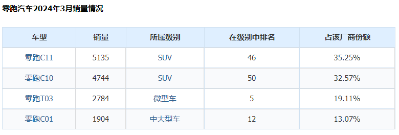 根據(jù)公布的3月交付成績(jī)來看,2024年3月零跑汽車交付量為14567輛,同比增長超136%,而第一季度累計(jì)交付則達(dá)到了33410輛。單月銷量大幅上漲主要得益于2024年度三款改款車型C11、C01和T03,以及全新車型C10的發(fā)布,主要是增程混動(dòng)產(chǎn)品。