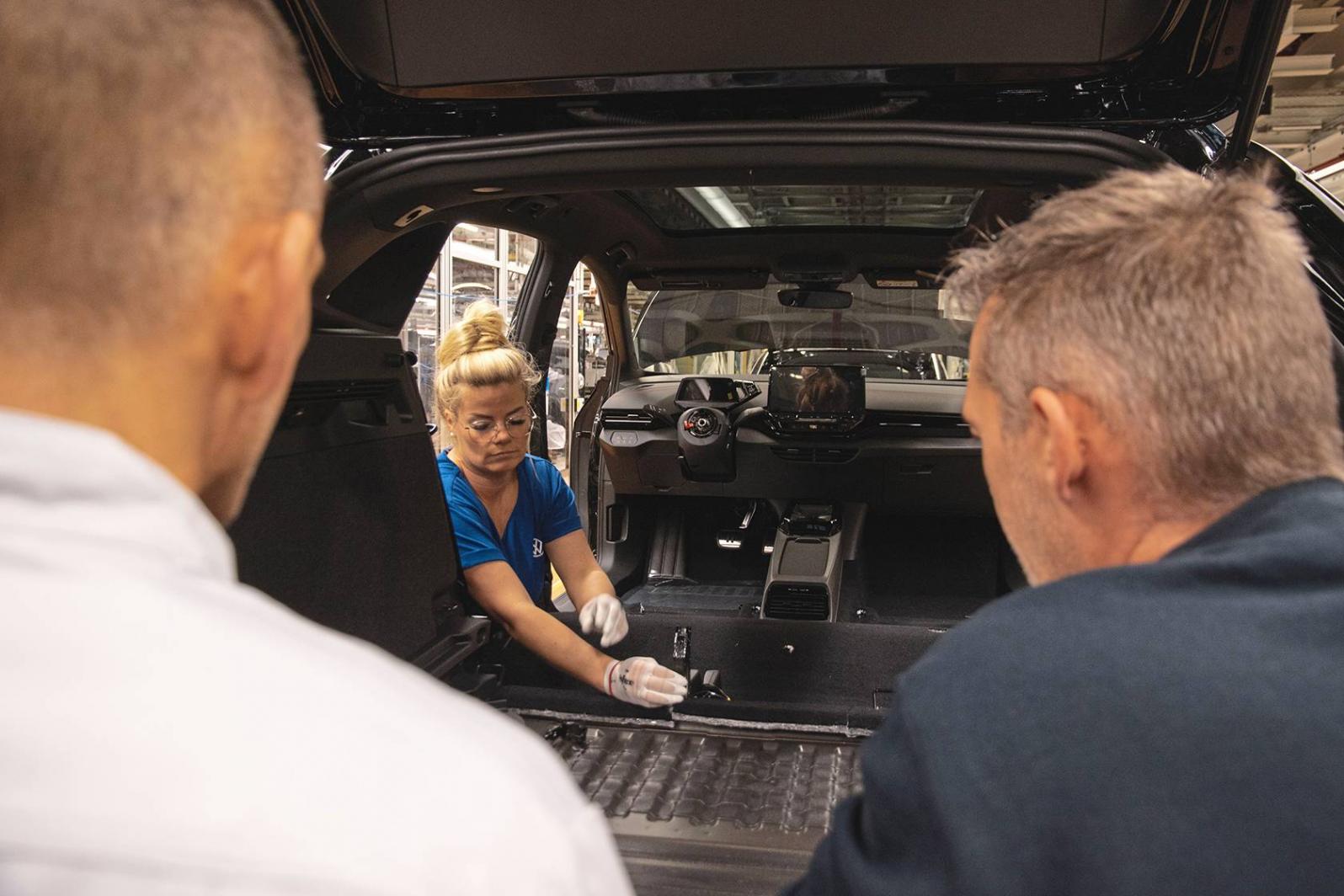 在此之前,你可以將那些關于流水線的陳詞濫調拋到九霄云外,比如查理·卓別林的《摩登時代》中在不斷移動的流水線上單調地擰螺絲。來自埃姆德的奧托·瓦爾克斯(Otto Waalkes)在上個世紀的《蘇西·索格羅斯》(Susi Sorglos)中曾歌頌大眾汽車流水線上的人道主義勞動條件:“有彩色的螺絲刀。”現在,由10至12名女性和男性工作人員組成的團隊接受了所有關于必要技能(安全、質量、人體工程學)方面的培訓,并與他們選擇的團隊負責人一起工作。每個人都站在汽車生產線的移動傳送帶旁邊,無需不斷走到汽車邊上。汽車被放在一個高度可調的基座上,車門在噴漆后到進一步組裝之前被拆除,以便一切都可以輕松完成。