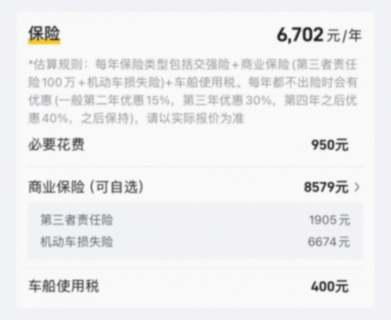 綜上,第一年的保險費用總計為:交強險+車船稅+商業保險=9929元。若每年無出險記錄,保險費用會逐年遞減,如第二年可享8.5折優惠,費用約為8440元;連續兩年無出險,第三年保費打7折,費用約6950元;連續三年無出險,第四年保費6折,約5957元,并維持此折扣。