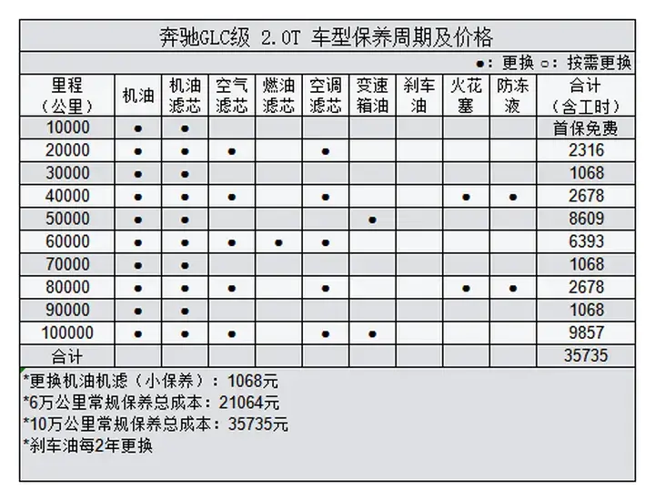 根據保養手冊,車輛的首保里程為10000km,建議保養間隔為10000公里或12個月(以先到者為準)。6萬公里內的保養項目及費用大致包括:機油、機油濾清器、空氣濾清器、空調濾清器、燃油濾清器、變速箱油、火花塞、防凍液及一些常規檢查,預計費用約為21064元。對于一臺豪華中型SUV,奔馳GLC的保養費用還是比較可觀的,且保養周期較長。