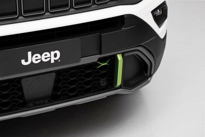 外觀上,Avenger 4xe延續(xù)在售純電動(dòng)版車型的基本造型,引擎蓋設(shè)有專屬的彩貼,前臉依舊采用封閉式七孔格柵,并與矩形大燈組形成一體,彰顯該品牌的越野個(gè)性。Avenger 4xe的下包圍則重新進(jìn)行了設(shè)計(jì),將燈組與熏黑格柵區(qū)分開,擴(kuò)大整個(gè)熏黑前包圍的面積,看起來有更強(qiáng)的侵略性,而且還在蜂窩狀格柵兩邊加入熒光綠飾條,并融入“X”造型標(biāo)識(shí),顯得十分前衛(wèi)。