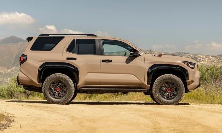 從車身側(cè)面來看,全新4Runner保留了經(jīng)典的硬派車身線條,車頂采用粗壯的行李架設(shè)計(jì),突出了輪拱和車門折線設(shè)計(jì)的立體感。車輛的離地間隙較高,搭配了高扁平比輪胎,同時(shí)車輛提供AT全地形輪胎可供選擇,越野性能相對好于標(biāo)準(zhǔn)版。和老款車型進(jìn)行對比,新車的軸距增加61毫米,并且車長增加119毫米,接近角和離去角各自為32度、24度。
