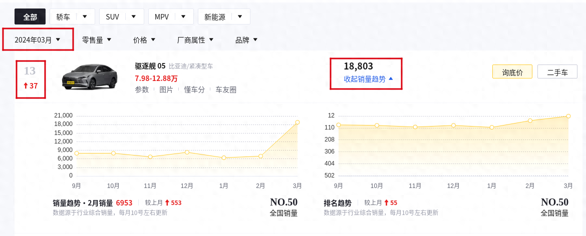 隨著新能源汽車的快速發展,越來越多的消費者在購車時都將購車目光投至到新能源汽車身上,其較低的用車成本也著實吸引了不少的消費者,畢竟現階段居高不下的油價,也讓很多朋友在購車時非常重視用車成本。今天我們要聊的這款車則是比亞迪旗下的比亞迪海洋網旗下的一款車型比亞迪驅逐艦05,在懂車帝發布的3月份汽車銷量排行榜中,驅逐艦05憑借18803輛的銷售成績拿下了3月份銷量排行榜第13名,相比上個月更是直接上升了37個名次。可見這款車整體的表現還是非常的亮眼。