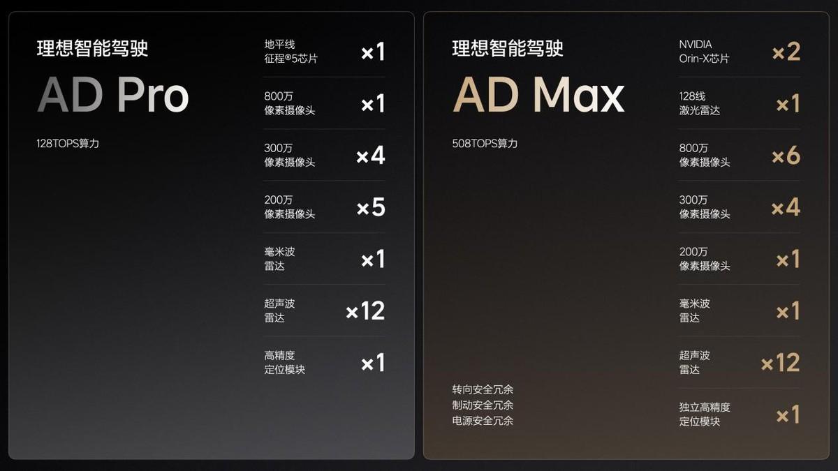 在智能駕駛方面,理想L6提供AD Pro和AD Max兩種配置。理想L6 Pro標配AD Pro,配備地平線征程5智能駕駛芯片,具備128TOPS算力,感知硬件匹配10顆攝像頭和1顆前向毫米波雷達。理想L6 Max標配理想AD Max ,配備2顆NVIDIA Orin-X智能駕駛芯片,508TOPS算力,感知硬件匹配1顆128線高分辨率激光雷達和環繞車身的11顆攝像頭,實現視覺和激光雷達雙重冗余。其中,AD Max還有三項更新:收費站自主通行、LCC 代駕指揮功能、城市NOA逐步開放到全國所有路段。