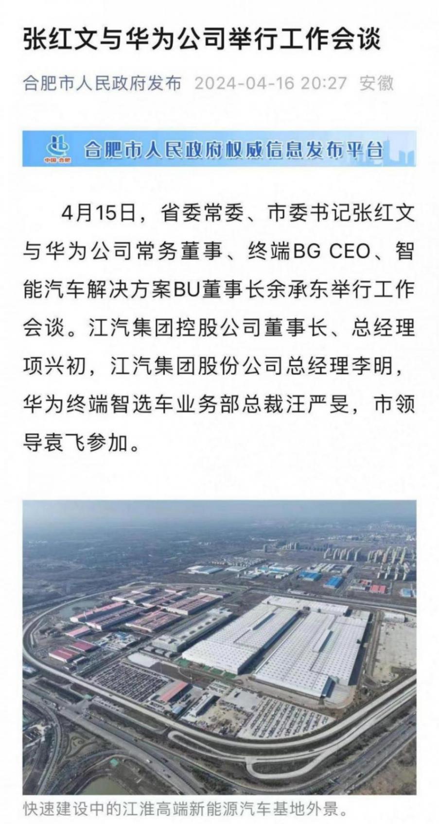 2023年12月,江汽集團與華為正式簽署戰略合作協議,雙方計劃在產品開發、生產制造、銷售、服務等多個領域全面合作,打造豪華智能網聯電動汽車。今年3月26日,江汽與華為簽訂合作備忘錄,雙方將基于以OpenHarmony為底座的HarmonyOS,啟動鴻蒙原生應用開發。