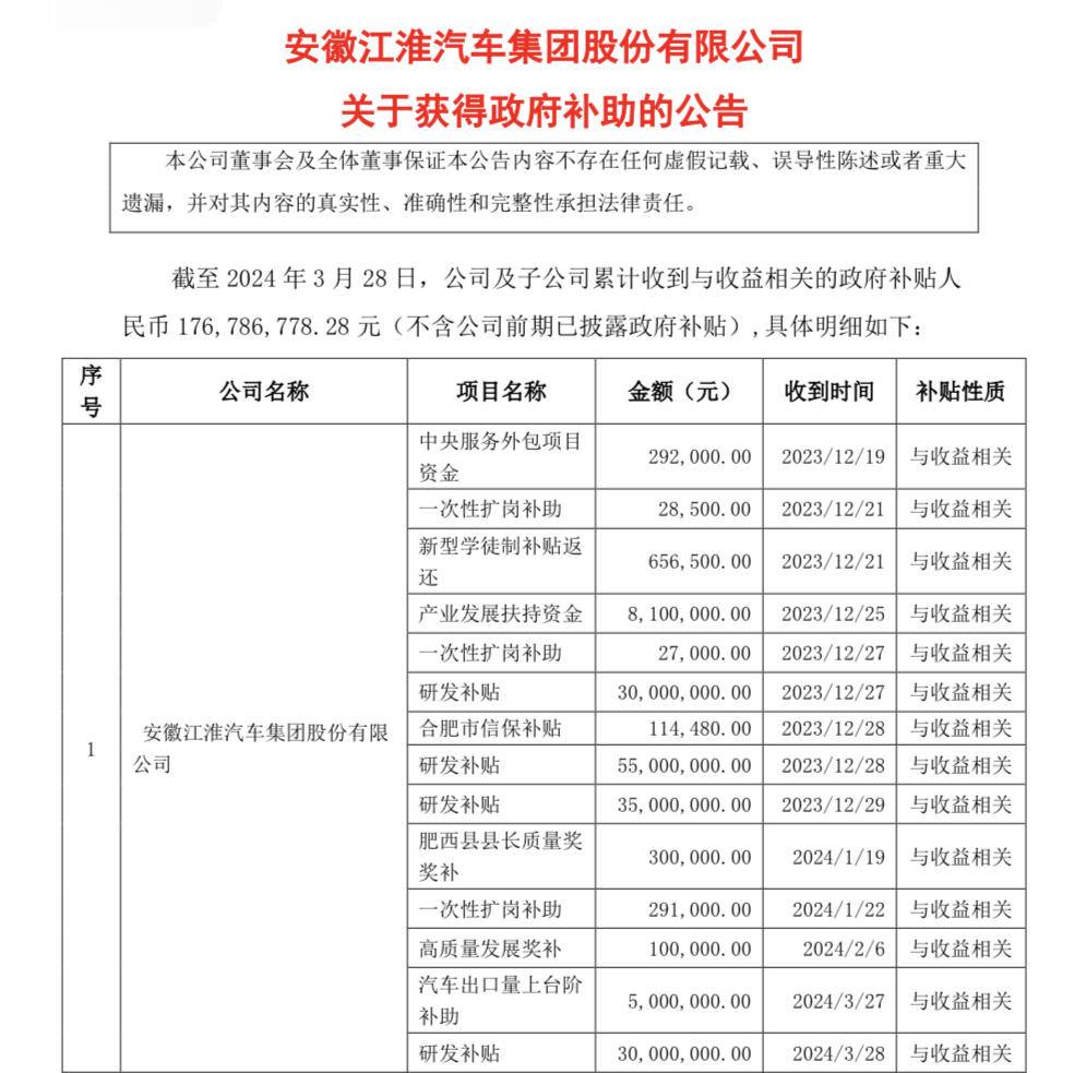 江淮還嚴重依賴政府補助。3月30日,江淮發布關于獲得政府補助的公告,截至2024年3月28日,公司及子公司累計收到與收益相關的政府補貼1.77億元。