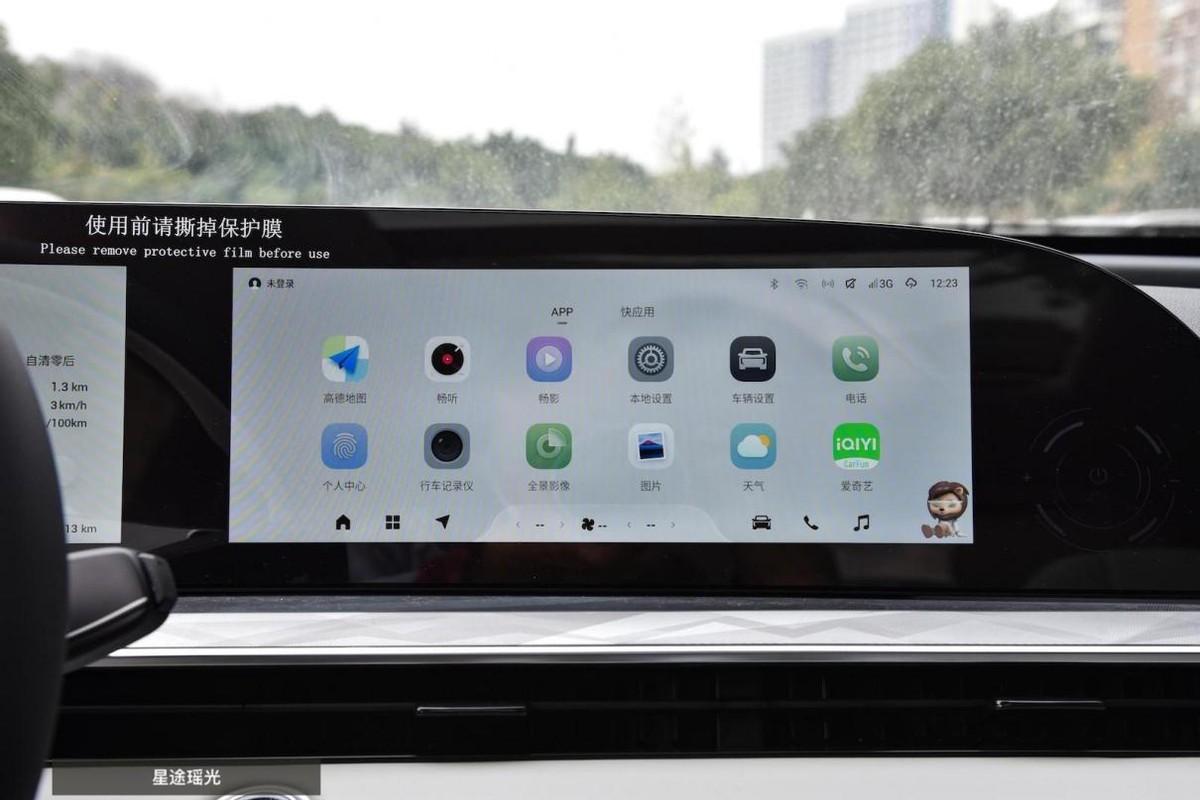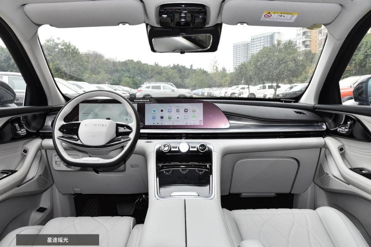 從內飾來看,瑤光深淺撞色也與外觀一樣高級,在把電子懷擋整合到雙輻式方向盤之中后,扶手箱前端完成的儲物抬升把駕駛艙一分為二,大量功能都通過帶金屬包邊的旋鈕來實現,而中控上的懸浮屏則實現了雙12.3英寸布局,并通過有高通驍龍8155芯片支持的雄獅系統實現了四區域可用、控制范圍更廣的語音控制,還多出了人臉識別、HUA抬頭顯示等功能。