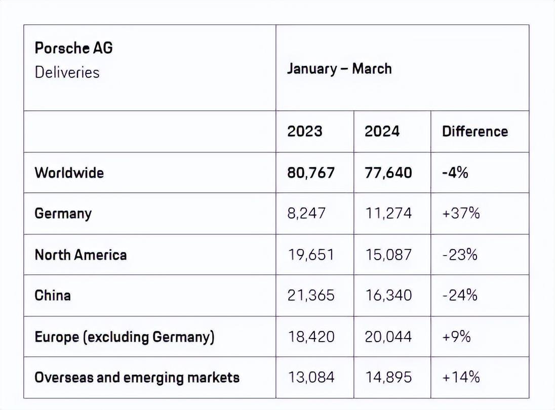 近日,保時捷官方發布了2024年一季度全球交付情況,數據顯示,2024年Q1,保時捷全球交付量為77640臺,同比下降4%,其中,中國、北美市場嚴重拖了后腿,與此同時,保時捷在歐洲市場呈現出蓬勃生機。