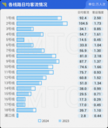 2024年春運期間(1月26日至3月5日),對外交通到發總量4354.3萬人次,日均到發108.9萬人次,同比2023年上升53%;兩場三站相關軌交站點日均進出站客流56.4萬人次,同比上升37.5%。其中客流比重最大為虹橋火車站,春運期間軌交日均進出站客流達20.1萬人次,同比上升32.0%。