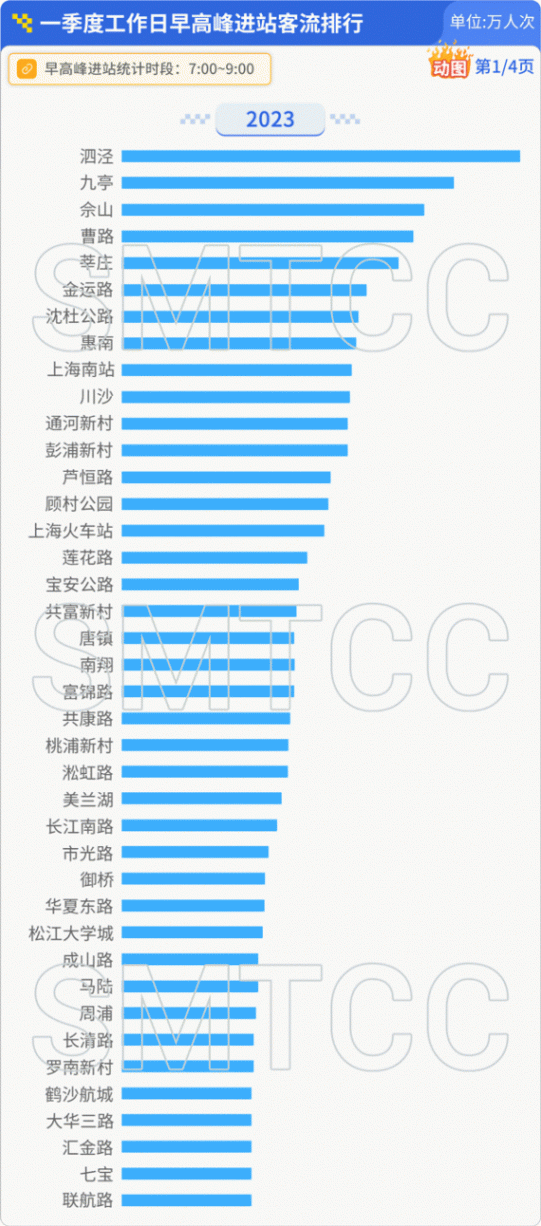 2024年一季度工作日早高峰進站及出站客流同比2023年,居住密集區域客流最大的五個站點仍是泗涇、九亭、佘山、曹路、莘莊,第六位惠南站客流同比上升5.6%;周浦、聯航路、羅南新村、嘉定北客流漲幅超10%;樞紐類站點虹橋火車站、上海火車站進站客流也同比大幅上升。