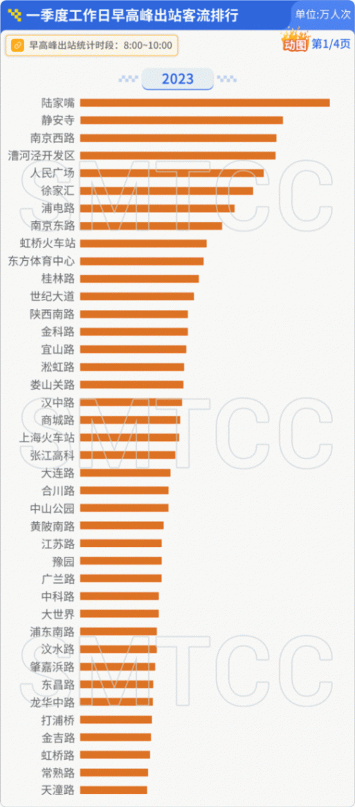 崗位密集區域站點方面,陸家嘴站客流同比大漲10%;漕河涇開發區、徐家匯客流同比有所下降;浦東南路、金吉路漲幅超10%。