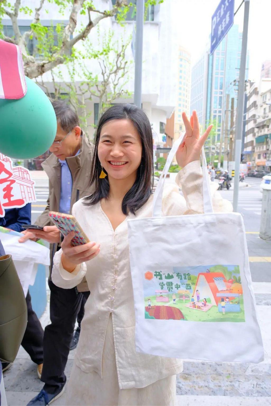 此外,現場各式各樣的文創產品深受大家的喜愛,帆布包、冰箱貼、徽章、書簽……通過集章打卡每位參與活動的朋友都能收獲滿滿。“作為外灘的居民,我感到非常的幸福,轄區內得天獨厚的文化優勢,讓我們學以致用。”山西小區的居民宋建成精心準備了一幅墨寶,讓現場的書香中還增添了濃濃墨香。