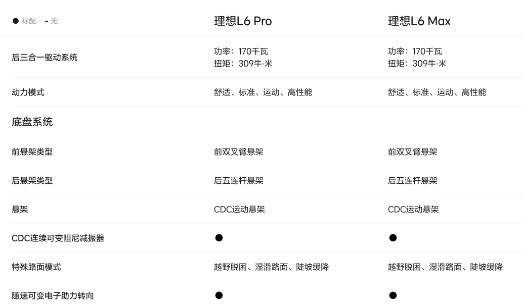 動力方面,理想L6標配1.5T增程器+雙電機驅動,配備60L油箱和36.8kWh磷酸鐵鋰電池組,最大功率300kW,峰值扭矩529N·m,零百加速僅需5.4秒。CLTC純電續航里程為212km,綜合工況續航里程達到1390km,同時還支持3.5kW外放電功能。