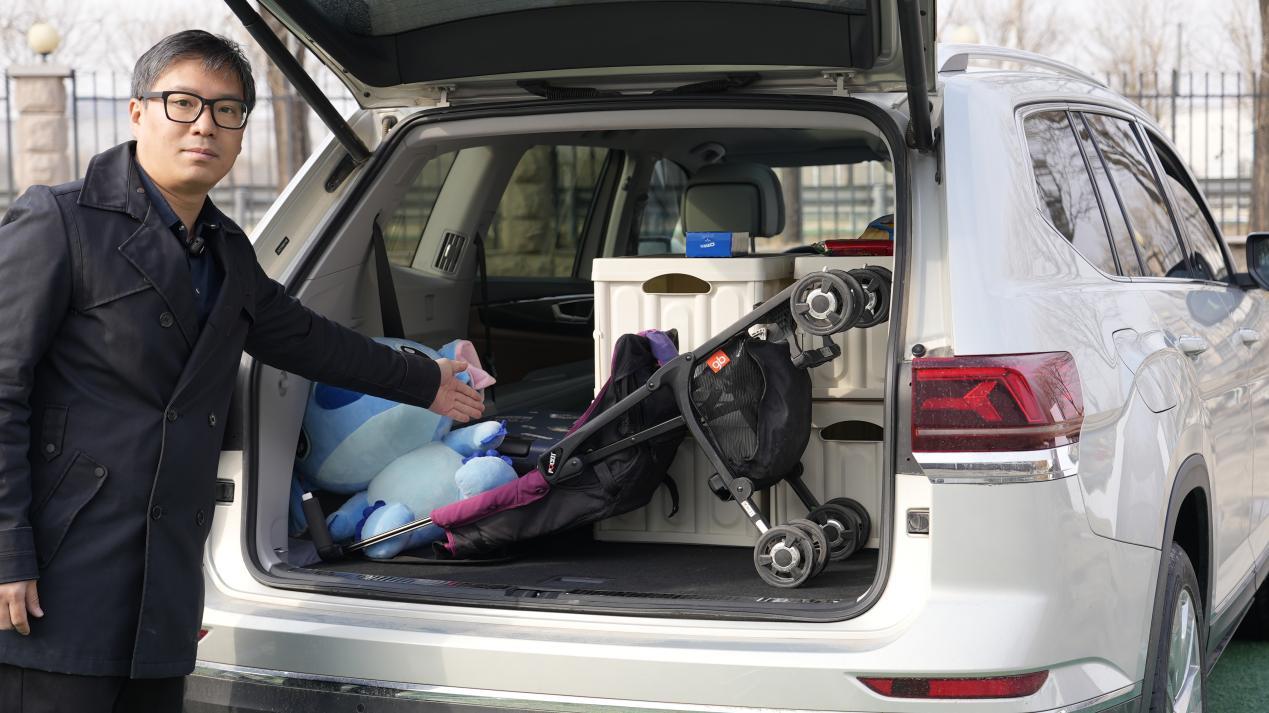 除了“全能都開”,“全家空間體驗”如何,也會影響家用SUV消費者的購車決策。從兩車載物空間實測來看,將兩車三排座放倒,同時放入嬰兒車、四個儲物箱和公仔玩偶后,途昂還留有一整個未使用的四分位座椅空間,如果是帶娃春游、露營,這里至少還能輕松放入天幕、折疊桌椅等物件。但同等物件放入漢蘭達車內后,空間可以說所剩無幾,基本只能放下一些小物件。