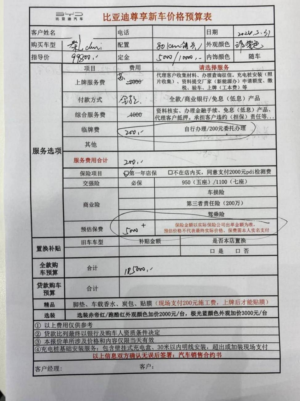 當我表示想選擇售價最低的入門款,并詢問銷售是否必須要額外再購買一些其他商品時,銷售并未說話,不知是否是因為沒聽清。不過后續在聊價格時,銷售僅計算了裸車價、5000元的保險費和200元的臨牌費(臨牌自行辦理的話不收費),所以最終預估價10.5萬元,看來不需要“配貨”。