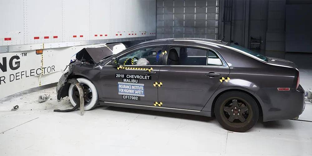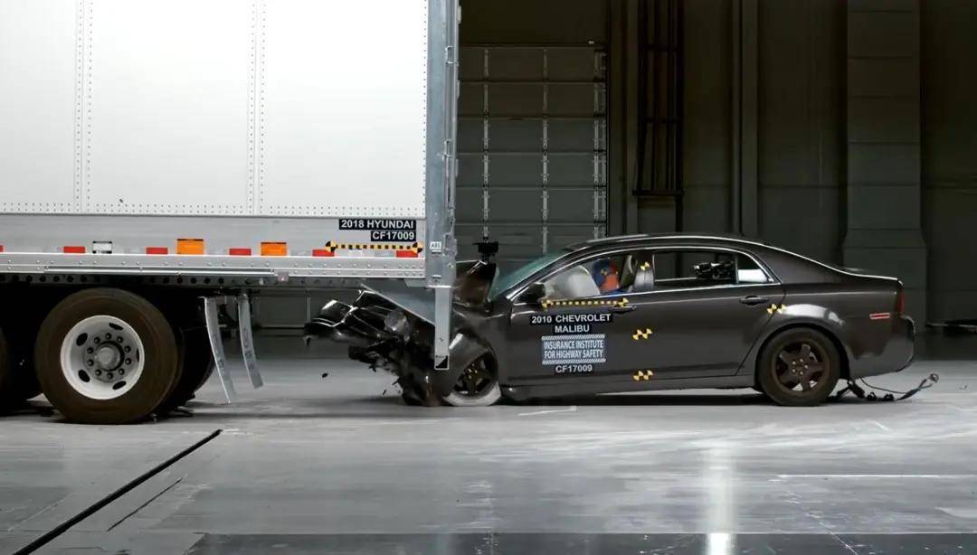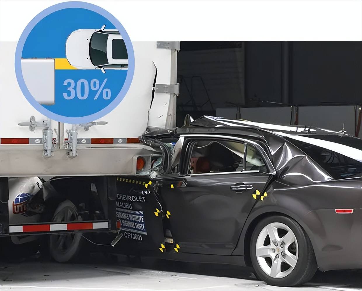作為全球標準最為嚴格的碰撞測試,美國IIHS(美國公路安全保險協會)在很久以前就已經有專門的針對大型車后部防撞欄的碰撞測試。當卡車后部設置有規范的防撞裝置時,后方的轎車在時速56km/h且呈30%偏置的情況下撞擊卡車的尾部,車輛的乘員艙整體保持完整,乘員也能得到有效的保護。