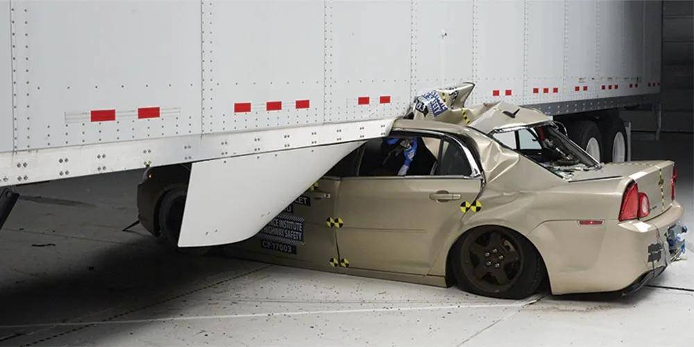 但是,由于貨箱構造的原因,卡車的側面以及后部的高度往往較高,小車追尾貨車時,整個車頭部分將完全失去吸能的作用,所有的碰撞動能都將完全由A柱以及薄薄的車頂所承擔。哪怕是勞斯萊斯、沃爾沃,面對這種極端工況的碰撞,車內乘員往往都是兇多吉少。