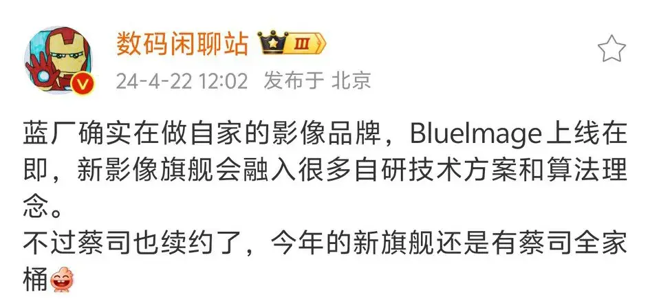 vivo注冊了一個影像品牌BlueImage,將首發搭載于X100 Ultra上面。這算是華為XMAGE之后,第二個手機廠商自研影像根據爆料新影像旗艦會融入很多自研技術方案和算法理念不過蔡司也續約了,今年的新旗艦還是有蔡司全家桶