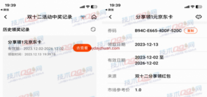 2、完成分享后返回活動首頁右上角【我的獎品】里面可以查看京東E卡卡密