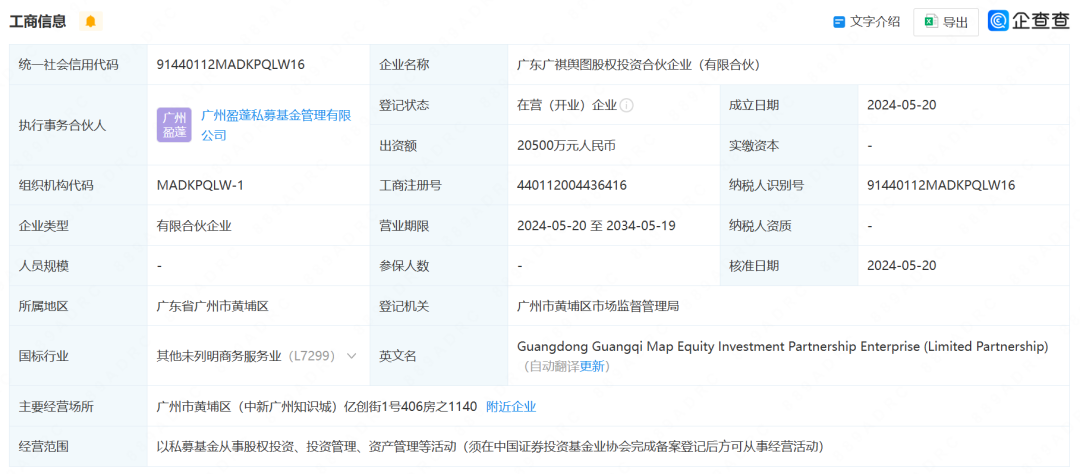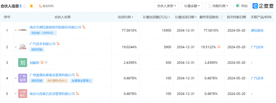 據企查查,廣祺輿圖執行事務合伙人為廣汽資本旗下廣州盈蓬私募基金管理有限公司。5位合伙人中,測繪股份出資最多,占比77.56%,認繳出資額1.59億元,廣汽資本認繳出資3900萬元,出資比例為19.02%。公司經營范圍為以私募基金從事股權投資、投資管理、資產管理等活動。