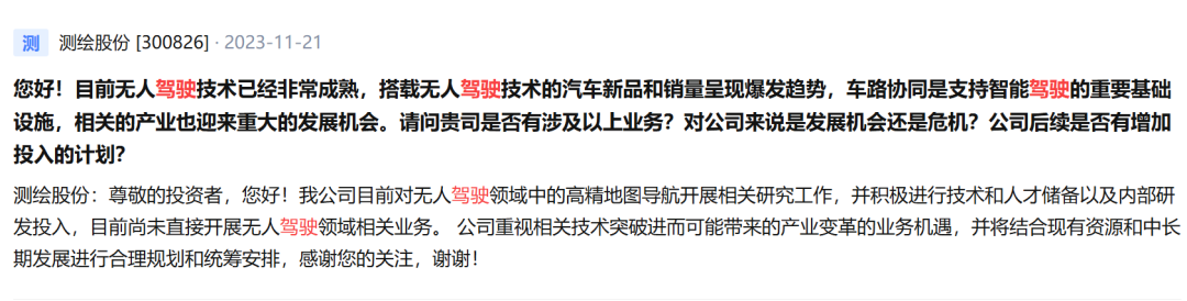 2023年11月,測繪股份在投資者互動中提到:目前尚未直接開展無人駕駛領域相關業務。只是對高精地圖導航開展研究工作,進行技術和人才儲備以及內部研發投入。