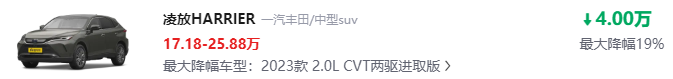 一汽豐田凌放,此車在市場當中銷量比較一般,并沒有特別大的一些銷售成績,目前現款車型官方售價21.18萬至29.88萬。在之前確實是沒啥優惠,而如今隨著市場壓力變大,此車最大降幅19%,來到4萬塊錢左右,確實像豐田亞洲龍,凱美瑞都有4萬左右的優惠,這款車如果沒有這好的優惠的話,確實也是很難賣的!