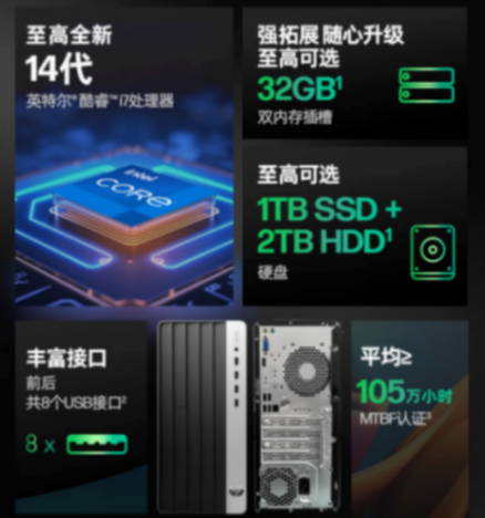 這款電腦配置了i5-14400處理器,6個性能核心,4個效能核心,10核,16線程,最高頻率4.60GHz,65W功耗。有兩個DDR4插槽,16GB DDR4內存,以及1TB M.2 SSD,并支持HDD擴展。