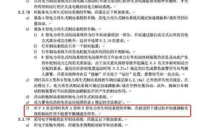 不過,最近工信部正在征求一些關(guān)于汽車制動(dòng)系統(tǒng)的國家標(biāo)準(zhǔn)的意見,其中有一條挺引人注目。這條說的是,對(duì)于 A 型及同時(shí)具有 A 型和 B 型電力再生制動(dòng)系統(tǒng)的車輛,在前進(jìn)擋下通過松開加速踏板實(shí)現(xiàn)的制動(dòng)作用不能使車輛減速至停車。