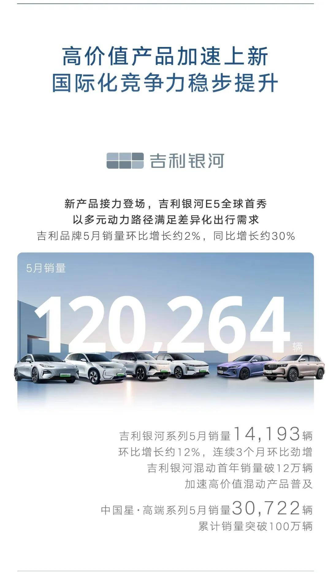 1-5月份,吉利集團累積銷量789,645輛,同比增長45%。在集團內部中,各品牌表現均十分搶眼。其中,吉利銀河系列5月銷量14,193輛,中國星系列車型5月銷量30,722輛。
