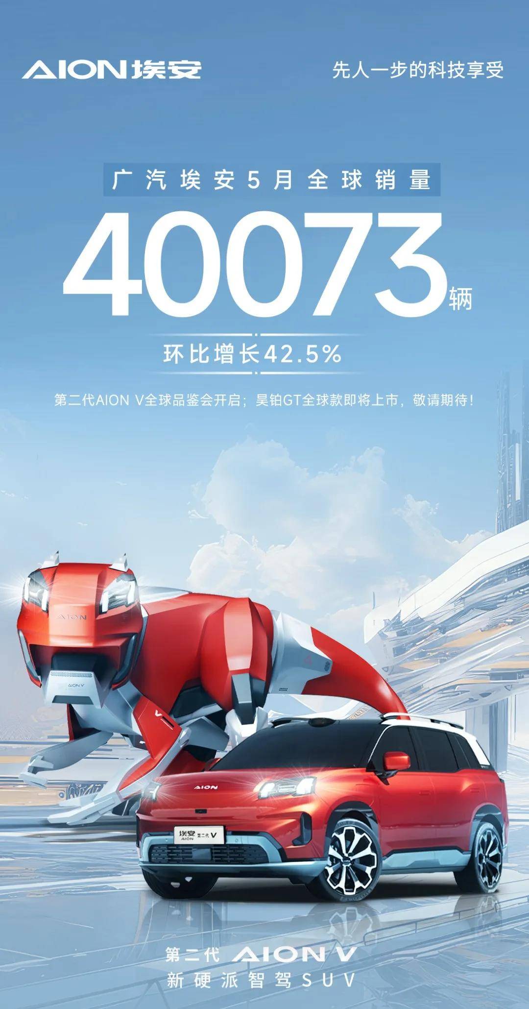 除了理想汽車之外,廣汽埃安在5月份也出現了強勢反彈的情況。廣汽埃安5月全球銷量40,073輛,環比增長42.5%。