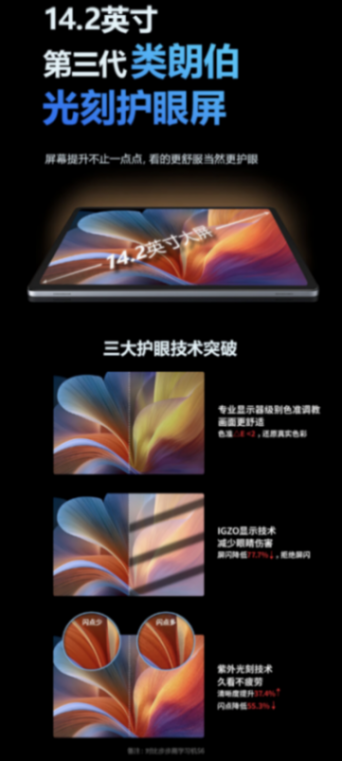 官方表示,步步高學習機 S8 搭載 14.2 英寸“類朗伯光刻護眼屏”,屏幕進行色準調教,△E<2;支持 IGZO 顯示技術,對比學習機 S6 屏閃降低 77.7%;外屏采用紫外光刻技術,清晰度提升 37.4%,閃點降低 55.3%。