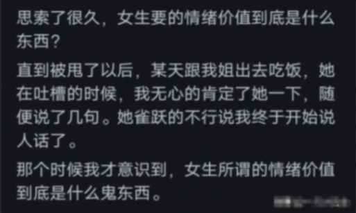 (10)女孩們的要求簡單得很,不過是找個伴一起數落前任,聽她發發牢騷。別總擺出一副“我耳朵塞驢毛了”的架勢,搞得自己跟青春期叛逆少年似的。