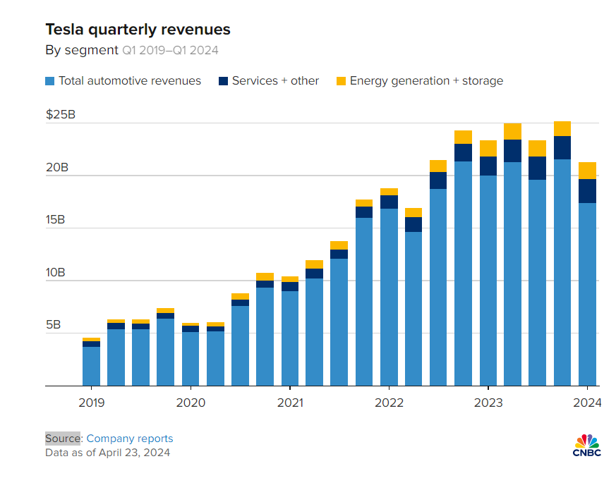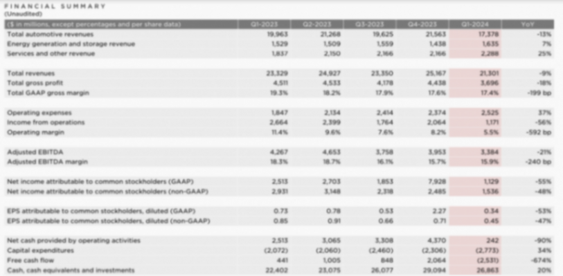 當地時間4月23日周二美股盤后,全球市值最大的汽車制造商特斯拉發布2024年一季度財報。財報顯示,特斯拉營收下降9%,為2012年以來的最大降幅,未達到分析師的預期,因為這家電動汽車公司經受了持續降價的影響。